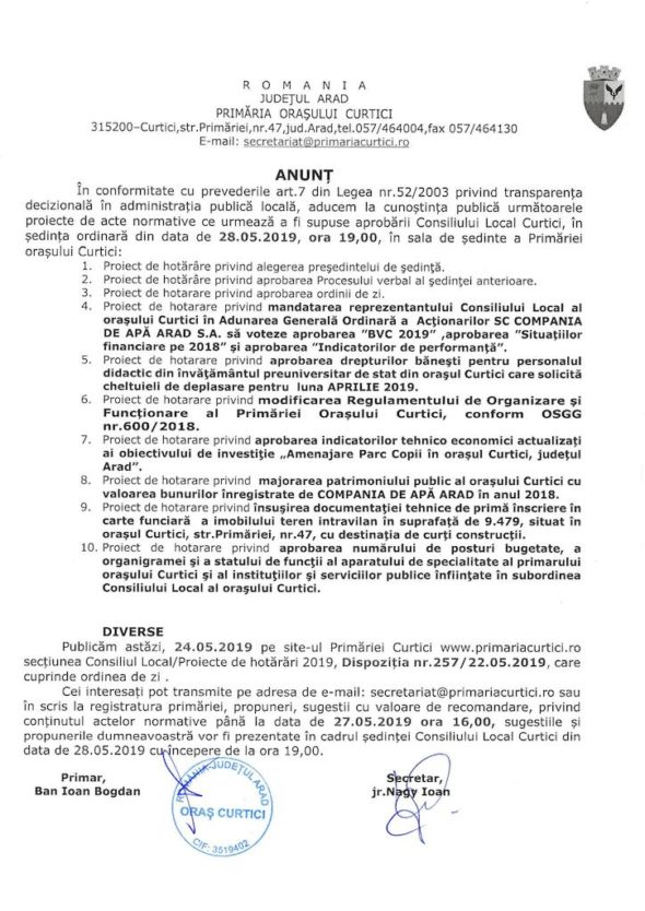 Anunț – ședința ordinară a C.L. Curtici din 28.05.2019